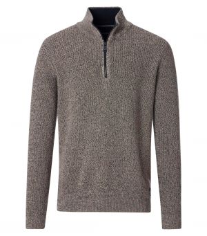 Kötött, cipzáras nyakú pulóver, mustár színben, 60% pamut, 40% poliakril.
