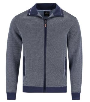 Sportos kardigán, cipzáras záródással, kontrasztos részletekkel, sötétkék színben, 62% pamut, 38% poliészter.