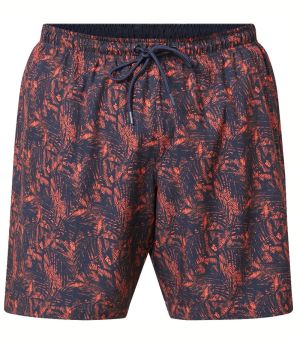 Kényelmes úszó short, elasztikus anyagból, gumis derékkal, derekában húzózsnórral, sötétkék-zöld mintával, 94% poliészter, 6% elasztán.