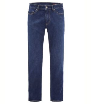 Kényelmes, 5-zsebes farmer, elasztikus anyagból, egyenes szárral, sötétkék színben, 98% pamut, 2% elasztán.