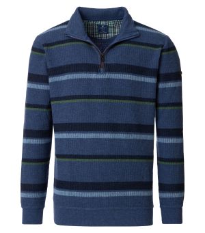 Sportosan elegáns kötött pulóver, cipzáras nyakkal, sötétkék alapon csíkos mintával, 60% pamut, 40% poliészter.